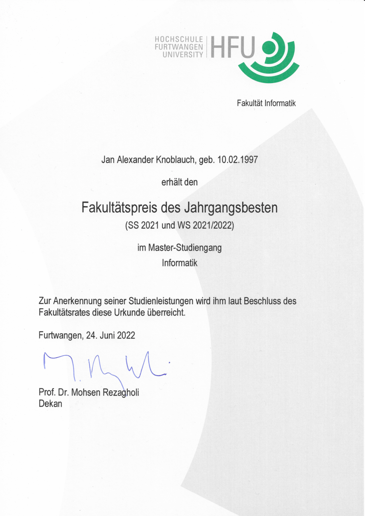 Im Februar 2022 habe ich das Master-Studium "Informatik" an der Hochschule Furtwangen erfolgreich mit Auszeichnung abgeschlossen sowie den Fakultätspreis des Jahrgangsbesten gewonnen.
